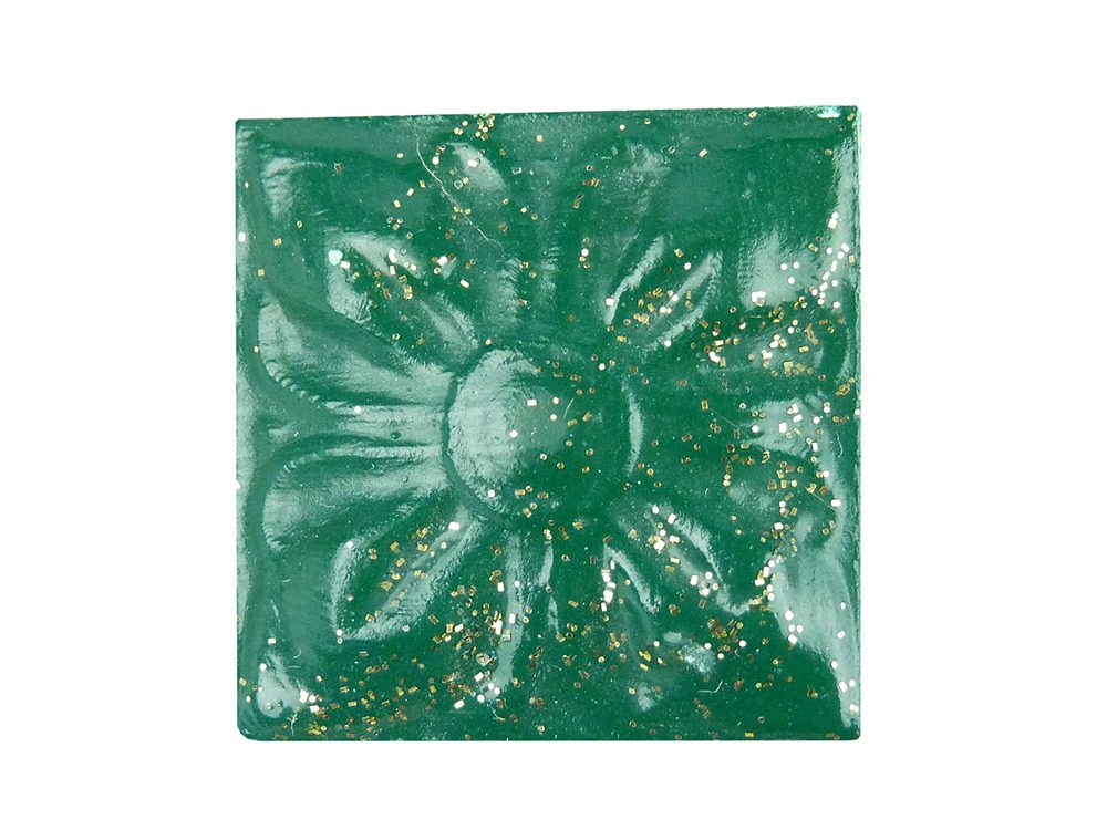 Transparante acrylverf met gouden glitters. Op het voorbeeld is dit aangebracht op een groen tegeltje.