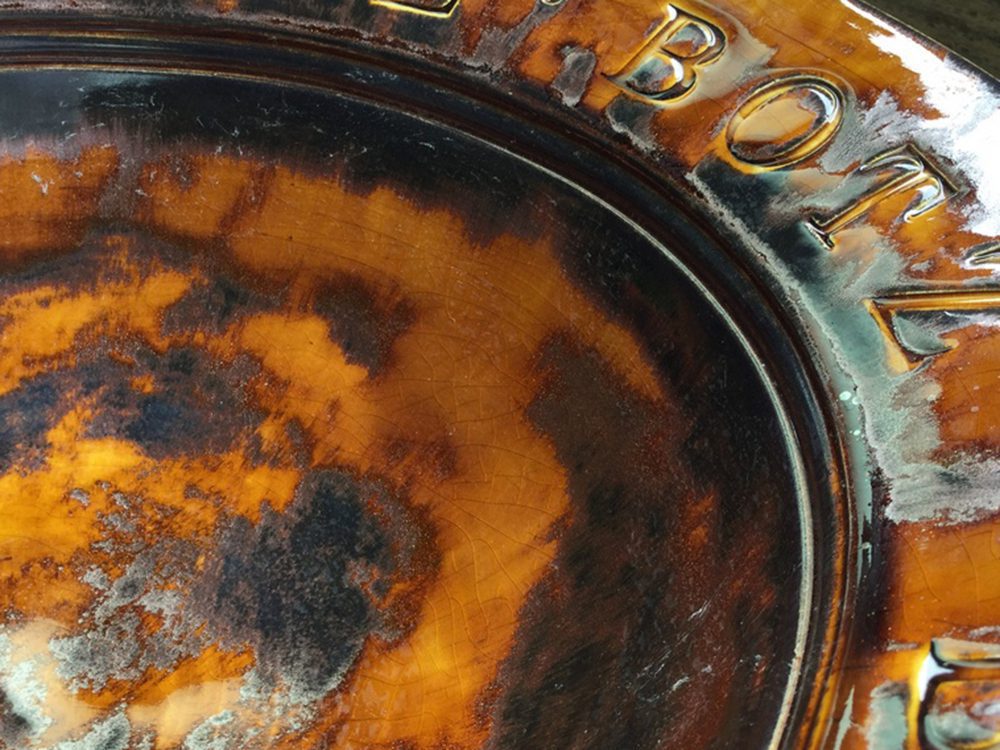 Roodbruin glazuur met glittereffect.